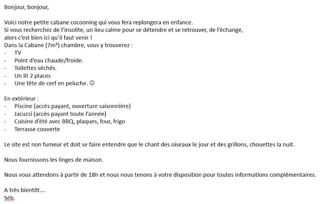 קבלת פנים חמה וידידותית מאוד.תפאורה נעימה ושלווה מאוד.בריכת שחייה מחוממת, ג'קוזי נהדר.תא הנוסעים נעים מאוד ושקט מאוד.מנוחה אידיאלית ומרעננת את עצמך?Sébastien ו- Chrystelle הופכים אתכם לנוחים מהר מאוד ותוכלו להצטרף אליהם ל -12 יורו בלבד.הערכתי ואחזור.